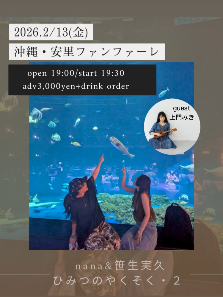 東京で開催した笹生実久とnanaのイベント『ひみつのやくそく』を、今回は沖縄で、ゲストの上門みきさんを迎えて開催!今回もあたたかい時間を過ごしましょう。